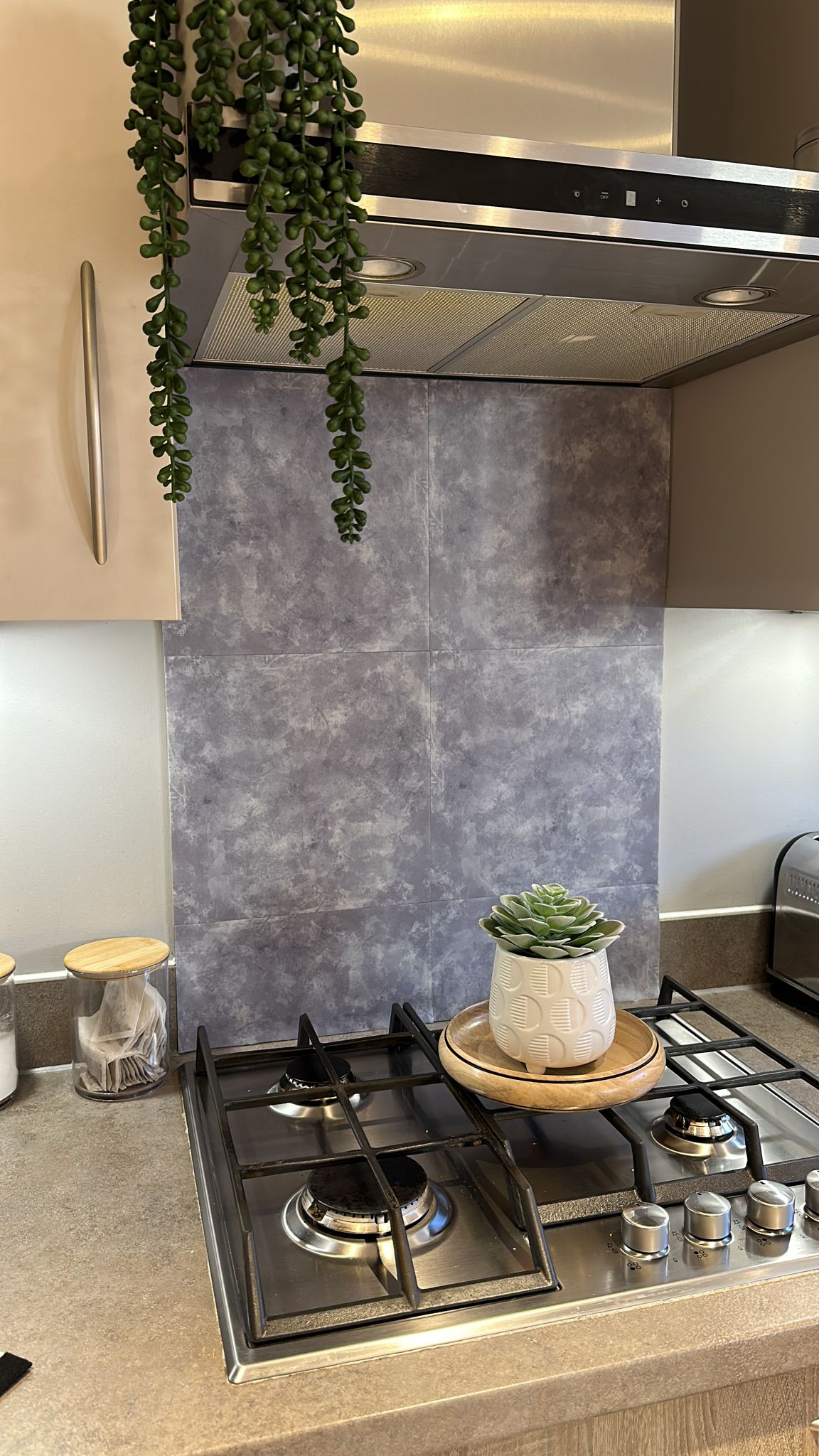 I had ordered a few samples as I wanted to cover our cooker hob splashback. Decided which one we liked best and ordered the size we needed. It arrived quickly and we were really excited to cover the old splashback. It was easier with 2 of us doing it, one smoothing it on and one holding the roll and letting it out gradually. We are really happy with the result. Many thanks Jesrose.